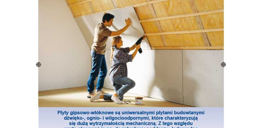 Płyty gipsowo-włóknowe są uniwersalnymi płytami budowlanymi dźwięko-, ognio- i wilgocioodpornymi, które charakteryzują się dużą wytrzymałością mechaniczną. Z tego względu, warto stosować je np. do zabudowy poddaszy. Jednorodna struktura materiału i zbrojenie włóknami sprawiają, że płyty są bardzo stabilne i mogą być poddawane dużym obciążeniom, występującym przy konstrukcji dachu wykonanej z drewna. Płyty te montuje się w systemie suchej zabudowy.